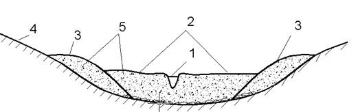 Рис. 7.2. Речная долина: 1 – русло; 2 – пойма; 3 – первая надпойменная терраса; 4 – склон долины; 5 – аллювиальные отложения