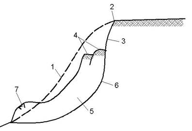 1 – первоначальная поверхность склона; 2 – бровка срыва;
