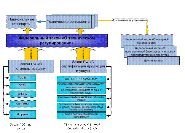 Закон устанавливает принципиально новую систему государственного нормирования требований к продукции или к связанным с ней процессам проектирования (включая изыскания), производства, строительства, монтажа, наладки, эксплуатации, хранения, перевозки, реализации и утилизации, систему нормативной документации, коренным образом меняет роль и значение стандартизации и стандартов, вносит ясность в ряд понятий, порядок функционирования различных институтов в данной области, включая организацию государственного контроля. (рис. 1).