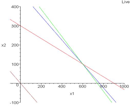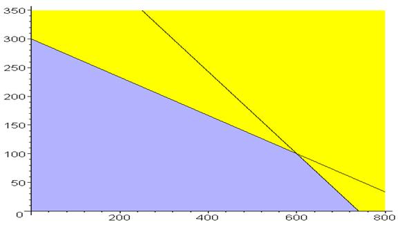 Темным цветом показана область допустимых решений. Теперь, если построить целевую функцию на этом же графике, то видно, что при параллельном переносе из точки (0,0) она становится касательной в точке (600,100).