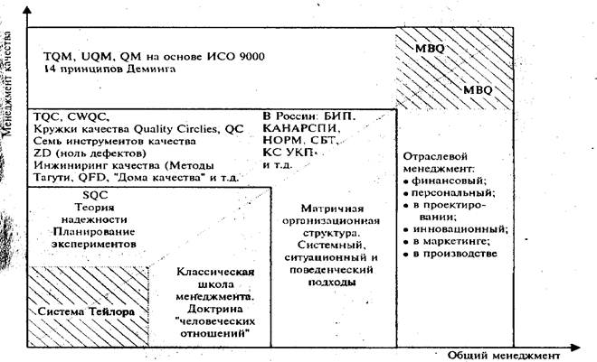 В то время, как представления о менеджменте качества включали в свою орбиту всё новые элементы производственной системы, накапливали и интегрировали их, общий менеджмент распадается на ряд отраслевых, достаточно независимых дисциплин - финансы, персонал, инновации, маркетинг.