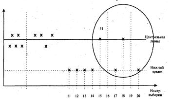 2) Расположение группы последовательных точек около одной контрольной границы, но не выход за неё - нарушение уровня настройки оборудования;