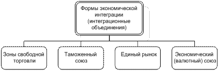 Интеграционная форма – представляет сначала объединение рынков, а впоследствии и производства нескольких стран в зону свободной торговли и предпринимательства, предопределяя тем самым формирование единого экономического пространства.