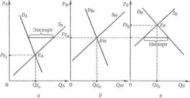 В качестве субъектов товарно–денежных отношений на мировом рынке могут выступать государства, отдельные компании, а также частные лица, формирующие в совокупности спрос и предложение для конкретной продукции, результатом взаимодействия которых является мировая равновесная цена. Чтобы понять, как это происходит, рассмотрим графическую модель условного примера. Предположим, две страны (А и В) производят и потребляют один и тот же товар, но ресурсы для его производства и потребности в нем в рассматриваемых странах различны. Поэтому на внутренних рынках обеих стран будут складываться разные рыночные равновесные цены и соответствующие им равновесные объемы продаж (рис. 3.1).