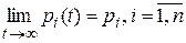 При t ® ¥ в системе устанавливается стационарный режим, при котором система случайным образом меняет свои состояния, но их вероятности уже не зависят от времени. Пределы вероятностей состояний при t ® ¥, если эти пределы существуют и не зависят от начального состояния системы, называются финальными вероятностями состояний: