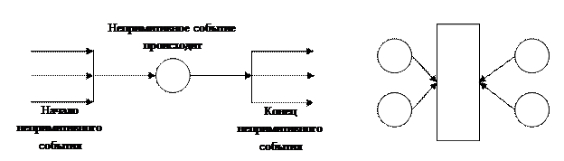 В сетях Петри предложено представлять непримитивные события в виде прямоугольника (рис. 5.3), а примитивные события планками. Прямоугольник имеет существенное значение при моделировании сложных систем на нескольких иерархических уровнях, т.к. он позволяет выделить в отдельный элемент сети целые подсети. Наличие прямоугольника подобно понятию подпрограммы в блочном программировании.