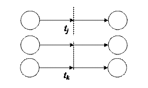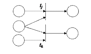 Если в какой либо момент времени разрешено более одного перехода, то любой из них может стать «следующим». Выбор запускаемого перехода осуществляется недетерминированным (случайным) образом. Недетерминированность и неодновременность запусков переходов в моделировании параллельной системы показывается двумя способами. Одна из них представлена на рис. 5.8. В этой ситуации два разрешённых перехода tj и tk не влияют друг на друга. В число возможных последовательностей событий входит последовательность, в которой первым срабатывает один переход и последовательность, в которой первым срабатывает другой переход. Эти два перехода могут быть запущены в любом порядке, это называется недетерминированностью и неодновременностью. Переход tk (рис. 5.4) может быть запущен в любом порядке, но обязательно при помощи маркеров в обеих позициях. Это называется одновременностью. Другая ситуация, в которой одновременное выполнение затруднено и которая характеризуется невозможностью одновременного запуска, показана на рис. 5.5. Здесь переходы tj и tk находятся в конфликте, так как запуск одного из них удаляет маркер из pi и, тем самым, завершает другой переход. Эта ситуация называется конфликтом и в моделируемых системах отображает борьбу за общие ресурсы.