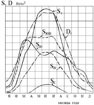 Рис. 4.15 Годовой ход интенсивности прямой и диффузной солнечной радиации для вертикальных поверхностей некоторых ориентации и горизонтальной поверхности в Москве