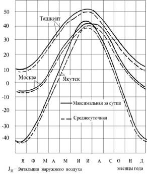 На рис.4.16 приведен годовой ход максимальной и средней за сутки энтальпии, а на рис.4.17 среднесуточного влагосодержания наружного воздуха, параметров, во многом определяющих режим обработки и расход энергоресурсов на обработку воздуха в СВ и СКВ.