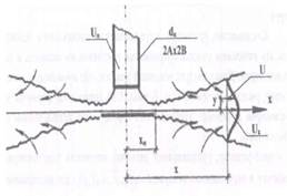 Длина участка формирования составляет для осесим- метричных струй (1-2)D, для плоских -(2-2.5)В. Здесь D- диаметр круглого источника или эквивалентный диаметр прямоугольного источника с соотношением сторон