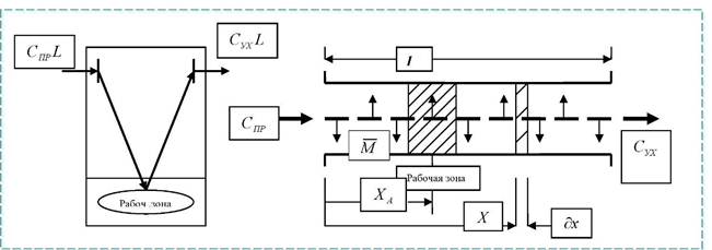 Рассмотрим идеализированную схему вентиляционного процесса в помещении. На рис.6.7.а схема вентиляционного процесса показана в виде условного пути приточного воздуха в помещении, а на рис.6.7.б - в виде канала с равномерно распределенным по длине выделением газовой вредности. Движение приточного воздуха по каналу моделирует вентиляционный процесс ассимиляции вредности.