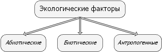 Все, что окружает организмы (живые системы), прямо или косвенно влияя на их состояние и функционирование, носит название окружающей среды, которая включает как природную, так и техногенную, созданную человеком, составляющие. Компоненты среды, способные оказывать прямое или косвенное влияние на живые организмы, называются экологическими факторами, которые по природе их происхождения традиционно делят на три группы: абиотические, биотические и антропогенные.