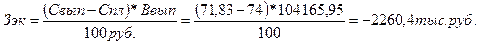 Вывод: Себестоимость 100 руб выручки по сравнению с планом уменьшилась на 2,17 рубля, что в процентном соотношении составляет 2,93%, за счет снижения себестоимости 100 руб. выручки предприятие получит экономию в размере 2260,4 тыс. рублей.