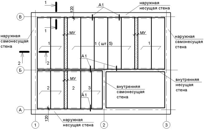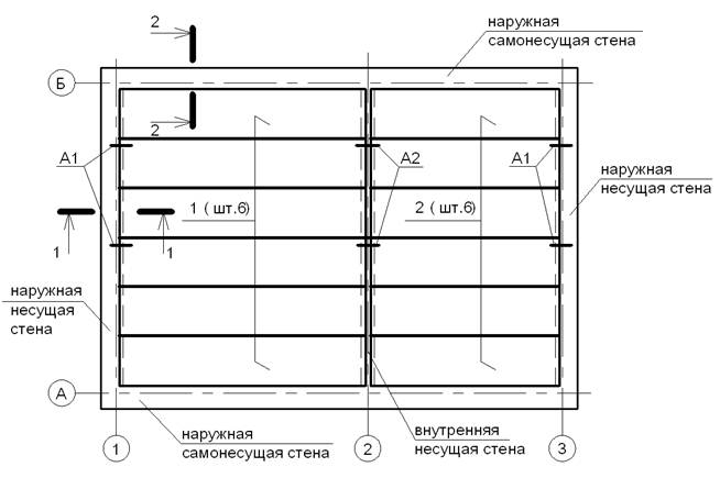 2. В поперечном направлении (оси 1, 2, 3) укладываем ригели.