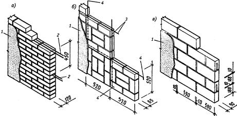 а – кирпичная перегородка в ½ кирпича армированная; б – то же, в ¼ кирпича; в – из мелких легкобетонных блоков с пустотами; 1 – отделочный слой; 2 – арматура горизонтальная Ø 2…6 мм; 3 – то же, вертикальная и горизонтальная Ø 4…6 мм; 4 – отгибы арматуры для крепления к стенам и перекрытию