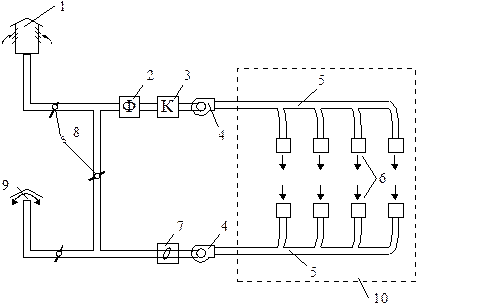 1 - воздухозаборная шахта; 2 - фильтр для очистки воздуха от пыли; 3 – колорифер; 4 – вентилятор; 5 – воздуховоды; 6 - приточные и вытяжные отверстия; 7 - пылеотделяющее устройство; 8- клапаны; 9 - вытяжная шахта; 10 – помещение