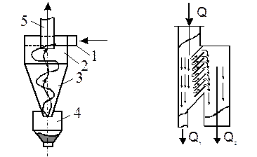 1- входной патрубок; 2- корпус; 3- выходной патрубок; 4- бункер