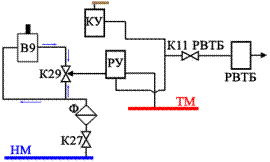 Подключение: НМ подсоединяется к разобщительному устройству через кран К-27 (кран постоянно открыт, находится с левой стороны под кабиной машиниста). При подаче питания на вентиль В9 - положение крана К29 - А. (Автоматическое), или при переводе крана К29 в положение Р. (Ручное) воздух из НМ поступает под поршни разобщительного устройства. Поршни разобщительного устройства силой воздуха снизу поднимаются вверх, и клапаны открываются, подключая НМ и ТМ к реле давления. Одновременно воздух из НМ через кран К29 поступает под питательный клапан крана управления.