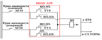 Кран машиниста в штатном режиме включён в работу вентилем В-9, получающим питание при включении контроллера реверса основного (КРО) или контроллера реверса резервного (КРР) по цепи: +75В, панель поездной защиты (ППЗ), автоматы защиты «питание кран машиниста основное» или «питание кран машиниста резервное», контроллер реверса основной или контроллер реверса резервный включённый в положение «ВП - вперед» или «НЗ - назад», вентиль В-9.