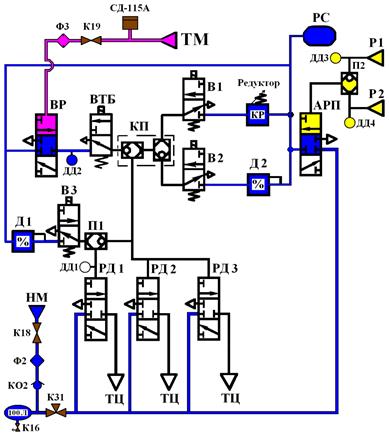 При снятии питания с "ВТБ" (разрыв «петли» безопасности, или при 3 уставке торможения от КТР), через "ВР, КП и П1" происходит наполнение управляющих полостей "РД1, РД2, РД3". Для перехода на вторую уставку удержания необходимо восстановить питание "ВТБ" переключив, с выдержкой, контроллер реверса основной "КРО" или нажать кнопку отпуск один раз. В случае, если при сработке петли безопасности нет возможности её восстановить (обрыв электрических цепей, повреждение межвагонных соединений, короткое замыкание и.т.п.), то для отпуска тормоза необходимо перевести тумблер "Тормоз экстренный" в верхнее положение, ручку крана К29 в рабочее положение "Р", а ручку крана машиниста во II положение (давление в ТМ 5,2±0,1 атм.), это давление обеспечивает отпуск "ТЦ". При электрическом торможении: вентилем В1 - управляет КР; вентилем В2 - управляет Д2; вентилем В3 - управляет Д1. При подаче напряжения на "В1", давление сжатого воздуха от "КР", ограниченное авторежимом, поступает к "КП", "П1" и далее к управляющим полостям "РД1", "РД2", "РД3". При подаче напряжения на "В2", давления сжатого воздуха от "Д2", ограниченное авторежимом, поступает к "КП", "П1" и далее к управляющим полостям "РД1", "РД2", "РД3". При подаче напряжения на В3 давление сжатого воздуха от Д1, также ограниченное авторежимом, поступает к П1 и далее к управляющей полости "РД1".