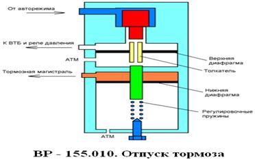 Максимальное из этих двух давлений выбирает переклю- чатель - "П2" и подает его в управляющую полость АРП. Тормозные процессы при пневматическом управлении (зарядка и разрядка тормозной магистрали) осуществляется краном машиниста из кабины управления поездом. Штатное, "6" положение ручки крана машиниста {3,1 ±0,2 атм.}, вводит "ВР" в режим полного служебного торможения и в его выходном канале, соединенным с ВТБ, устанавливается давление, ограниченное авторежимом "АРП".