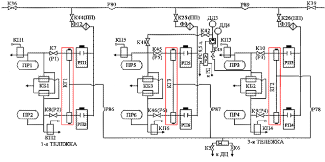 Ø третьей тележки воздух из НМ поступает через разобщительный кран К26, фильтр Ф10, регуляторы положения кузова РПЗ и РП4, ограничительный клапан КГ2, разобщительные краны К9 и К10 и соединительные рукава Р57, Р58 – 3 и 4 пневморессоры (ПРЗ и ПР4).