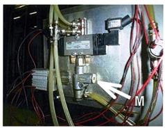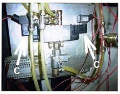 С помощью вентиля аварийного открытия из дверной системы удаляется давление. Дверь вручную выталкивается в другое крайнее положение. Если теперь быстро дать давление в систему дверь с силой захлопнется и при этом может повредить конструкцию. Цилиндр должен заполняться воздухом медленно. Клапан медленного заполнения (М) поворачивается в сторону закрытия. Давление медленно подается в систему с помощью клапана аварийного открытия. Дверь теперь должна оставаться на месте, но если сопло клапана медленного заполнения чуть подтекает, дверь может медленно двигаться. Регулировочный винт (М) клапана медленного заполнения открывается и таким образом регулируется поступление воздуха в систему с такой скоростью, чтобы дверь не двигалась слишком быстро на стадии заполнения. Та же самая стадия регулировки повторяется столько раз, сколько потребуется до достижения приемлемой скорости движения двери. Когда давление в системе поднимется выше 3.5 бар, зажим клапана медленного заполнения полностью открывается, и клапан более не является препятствием для потока воздуха. Открытие клапана можно констатировать по тому, что регулировочный винт (М) выталкивается вверх. Приемлемое время заполнения 5…10 сек. При необходимости открытием и закрытием дверей можно управлять без напряжения с помощью катушек воздухораспределителя (С).