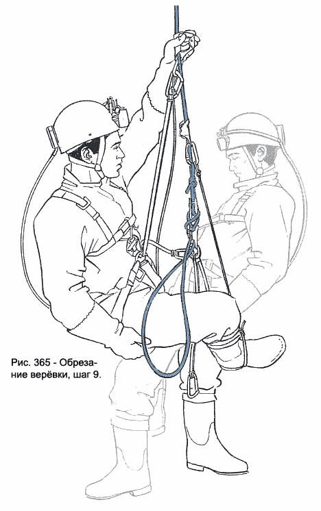 10. Я перерезаю верёвку прямо над кролем пострадавшего. Поскольку я выбрал всю слабину над спусковым устройством, это приведёт к очень небольшому рывку, когда наш вес нагрузит его (рис. 366).