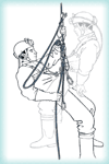 5. теперь он просто руками пытается поднять за рапель пострадавшего, стараясь собственным весом вытянуть из 3-го карабина петлю рапели. Самый трудный—первый момент, а потом уже начнет работать противовес, создаваемый весом спасателя на коротком усе.