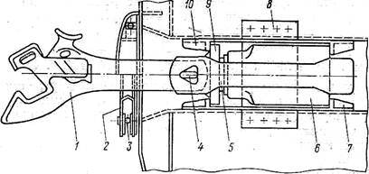 Рис. 8 г. 1-хомут; 2-клин; хвостовик; 4-замок; 5-замкодержатель; 6-балансир валика; 7-рычаг.