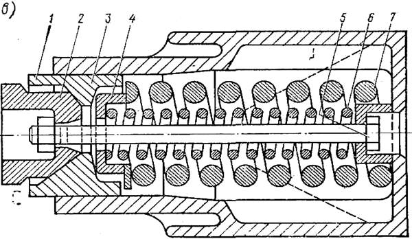 Поглощающий аппарат автосцепки (рис. 8, в) состоит из корпуса 1, в котором заключены стянутые болтом 5 нажимной корпус 2, нажимная шайба 4 с фрикционными клиньями 3 и цилиндрические пружины 6 и 7. поглощающий аппарат амортизирует растягивающие и сжимающие усилия с одинаковой эффективностью. При сжатии поглощающего аппарата совершается работа, часть которой накапливается в виде потенциальной энергии от сжатых пружин 6 и 7, а большая часть переходит в тепло при трении фрикционных клиньев 3 о нажимной корпус 2 и корпус 1.