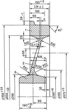 Для рационального взаимодействия колеса и рельсового пути важное значение имеет форма поверхности катания — профиль колеса. На рис. 10. показан стандартный профиль поверхности катания, который имеет колесо после обточки. Этот профиль характеризуется гребнем высотой 28 мм и толщиной 33 мм, измеренной на расстоянии 18 мм от его вершины, конической поверхностью катания с уклоном 1:20 и 1:7 и фаской 6x6 мм. Гребень, предохраняющий колесную пару от схода с рельсов, имеет угол наклона наружной грани, равный 60°. Коническая поверхность в отличие от цилиндрической предотвращает образование неравномерного по ширине колеса износа (проката), облегчает прохождение кривых и центрирует колесную пару в прямых участках пути. В связи с конической поверхностью колеса его диаметр измеряют в определенной плоскости (по кругу катания, находящемуся на расстоянии 70 мм от внутренней грани колеса).