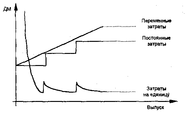 Скачкообразное изменение постоянных затрат и затрат на единицу продукции в зависимости от объемов выпуска.