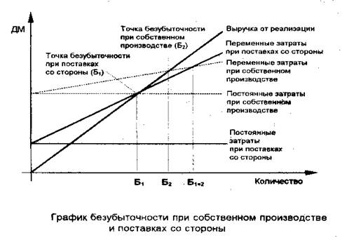 Посредством анализа величин в точке безубыточности можно определить, при каком объеме продукции собственного производства или поставляемой со стороны достигается безубыточность предприятия (см.рис. выше). Сплошные линии показывают изменение затрат при поставках со стороны, а пунктирные – при собственном производстве.