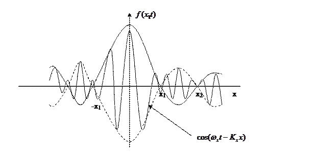 Рассмотрим большое количество монохроматических плоских волн с разной частотой и волновым вектором который растёт вдоль оси х