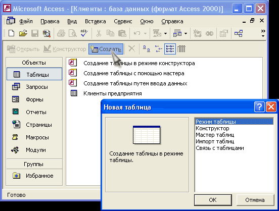 В Access используются три способа создания таблиц: путем ввода данных, с помощью Конструктора таблиц и с помощью Мастера создания таблиц. Для каждого из этих способов существует специальный ярлык новых объектов в списке таблиц. Если вы создали новый файл базы данных, то, кроме этих ярлыков, в списке таблиц больше ничего нет.