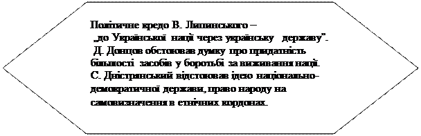 | В. Липин-ський | Класократія у формі історичного гетьманату | Територіаль-ний патріо-тизм, що базується на релігійному грунті | Хліборобський клас | Недотор-каність приватної власності як основи господа-рювання | Держава – нація - суспільство |