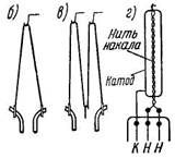 В зависимости от способа нагрева катода электрическим током различают катоды прямого накала и косвенного (подогревные). Катоды прямого накала представляют собой нить из тугоплавкого металла, нагреваемую непосредственно проходящим по ней током накала. Подогревной катод состоит из никелевой трубки, на наружную поверхность которой нанесен оксидный эмитирующий слой.