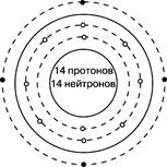 Ниже показана электронная оболочка атома кремния. В образовании химических связей и в процессе проводимости могут участвовать только четыре электрона внешней оболочки, называемые валентными электронами. Десять внутренних электронов в таких процессах не участвуют.
