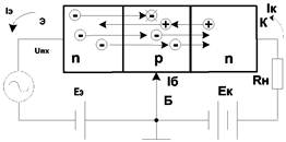 В базе электроны рекомбинируют, а их концентрация в базе пополняется от «+» источника Еэ, за счет чего в цепи базы будет протекать очень малый ток. Оставшиеся электроны, не успевшие рекомбинировать в базе, под ускоряющим действием поля закрытого коллекторного перехода как неосновные носители будут переходить в коллектор, образуя ток коллектора. Степень рекомбинации носителей зарядов в базе оценивается коэффициентом перехода носителей зарядов.