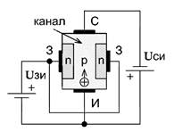 На затвор всегда подается такое напряжение, чтобы переходы закрывались. Напряжение между стоком и истоком создает продольное электрическое поле, за счет которого через канал движутся основные носители зарядов, создавая ток стока.