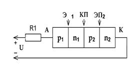 Наружная р-область и вывод от нее называется анодом. Наружная n-область и вывод от нее называется к атодом. Внутренние р- и n-области называются базами динистора. Крайние р-n переходы называются эмиттерными, а средний р-n переход называется коллекторным.