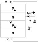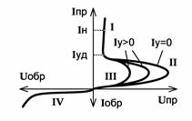 Тиристором называют переключательный прибор с тремя электронно-дырочными переходами и тремя выводами- анодом, катодом и управляющим электродом. Тиристоры обладают аналогичной динисторам структурой, а отличие состоит в наличии управляющего электрода - дополнитнльного вывода, подключенного к одной из баз. Если через управляющий электрод пропустить отпирающий ток, то тиристор перейдет в открытое состояние. В зависимости от того, к какой из баз присоединен управляющий электрод, можно организовать включение тиристора при подаче отпирающего напряжения между управляющим электродом и либо анодом, либо катодом. Вольтамперная характеристика тиристора похожа на характеристику динистора, однако отпирание тиристора происходит при более низких напряжениях. Чем больше ток управляющего электрода, тем при более низком прямом напряжении тиристор перейдет в открытое состояние.