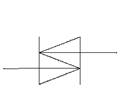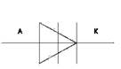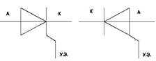 На рисунках ниже изображены условные графические обозначения (УГО) рассматриваемых приборов: динистора, тиристора с управлением по катоду, тиристора с управлением по аноду, неуправляемого симистора.