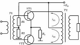 Во входной цепи включен трансформатор Tpl со средней точкой во вторичной обмотке. Это позволяет получить на базах транзисторов VT1 и VT2 два одинаковых по амплитуде и противоположных по фазе напряжения.