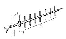 1 - кабель питания; 2 - рефлектор; 3 - директоры; 4 - активный вибратор. Направление максимального излучения показано стрелкой.