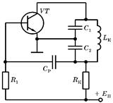 Одна из схем такого генератора приведена на рисунке ниже. В нем усилитель собран на транзисторе VT, включенном по схеме с ОЭ. Его полезной нагрузкой служит колебательный контур (C1 C2,LK).