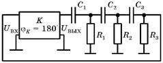 Значит, для обеспечения сдвига фаз 180° достаточно использовать две такие ячейки. Однако в этом случае коэффициент передачи цепи будет стремиться к нулю, что в автогенераторах затруднит выполнение баланса амплитуд. Поэтому компромиссным считается использование трех RC-ячеек, сдвиг фазы в каждой из которых выбирают близким к 60°, тогда суммарный сдвиг фаз составит 180°. Если, как и раньше, в качестве усилителя использовать каскад, создающий сдвиг фаз 180°, то общий сдвиг фаз составит 360° и баланс фаз будет выполнен.