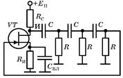 Недостатком генераторов гармонических колебаний с использованием резонансных усилителей является необходимость применения в них колебательных контуров, катушки индуктивности которых в случае низкочастотного диапазона оказываются громоздкими. Это затрудняет микроминиатюризацию аппаратуры. Поэтому актуальным является создание генераторов, не имеющих катушек индуктивности. Одним из их вариантов являются RC-генераторы. В них фильтрация колебаний и сдвиг фаз между выходным и входным напряжениями цепи обратной связи создается при помощи RC - ячеек. Существует несколько разновидностей таких генераторов, одна из которых приведена на риссунке.