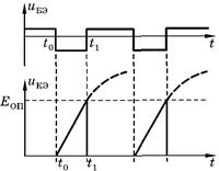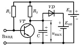 Здесь резистор R1 подает на транзистор VT начальное смещение, поддерживающее его в открытом и насыщенном состоянии. Промежуток коллектор-эмиттер открытого транзистора подключен параллельно конденсатору С и поддерживает на нем напряжение, близкое к нулю. Если в момент времени to между базой и эмиттером транзистора подать напряжение запирающей полярности иБЭ, то VT закрывается, и его шунтирующее действие на конденсатор прекращается. От источника питания Еп через резистор R3начинает протекать ток заряда конденсатора, и напряжение на нем, равное напряжению икэ= ивых, начинает возрастать. В момент t импульс, запирающий VT, прекращается, и транзистор опять переходит в открытое и насыщенное состояние.
